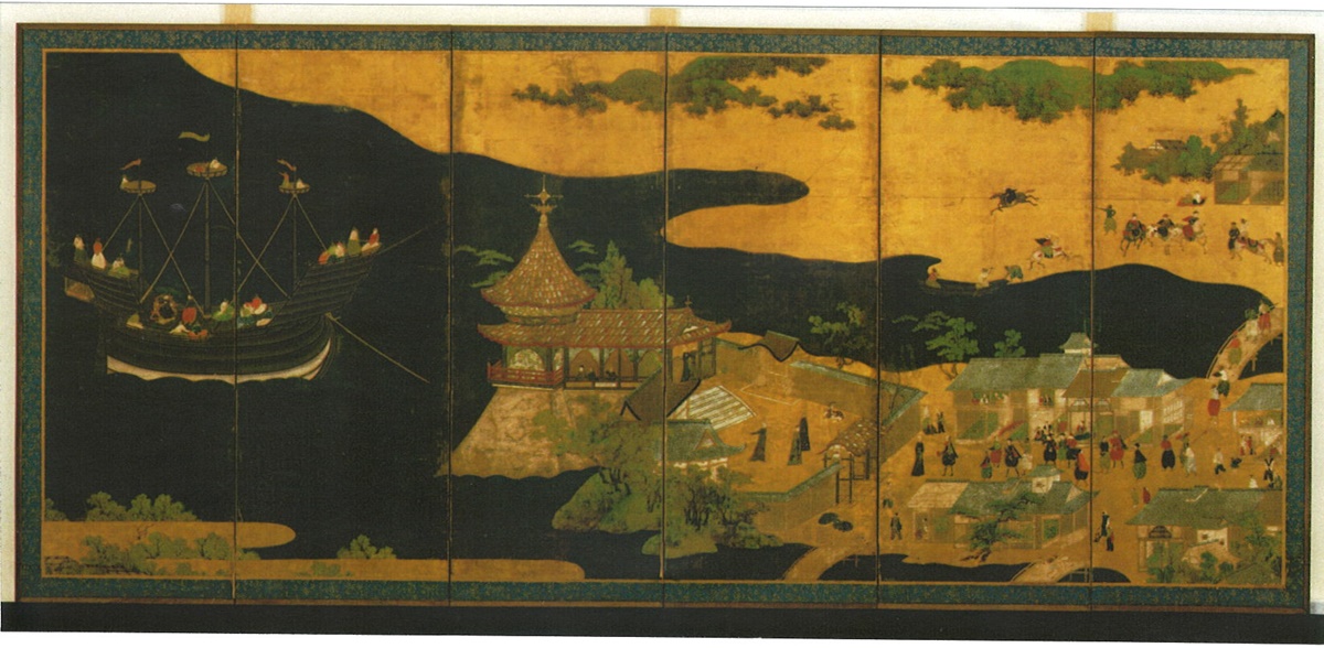 | 長崎港を描いた南蛮屏風の中で、岬の教会を中心に描写した屏風は希少、港の方向に石垣からせり出すように建てられた教会は方形の塔を持ち、屋根には赤緑青などカラフルな瓦を使用している。赤い欄干や外壁の仕様は周囲の建物とは異なり、敷地入り口の門にも同じ瓦が使われている。福井県駿河地方で発見された。 | |